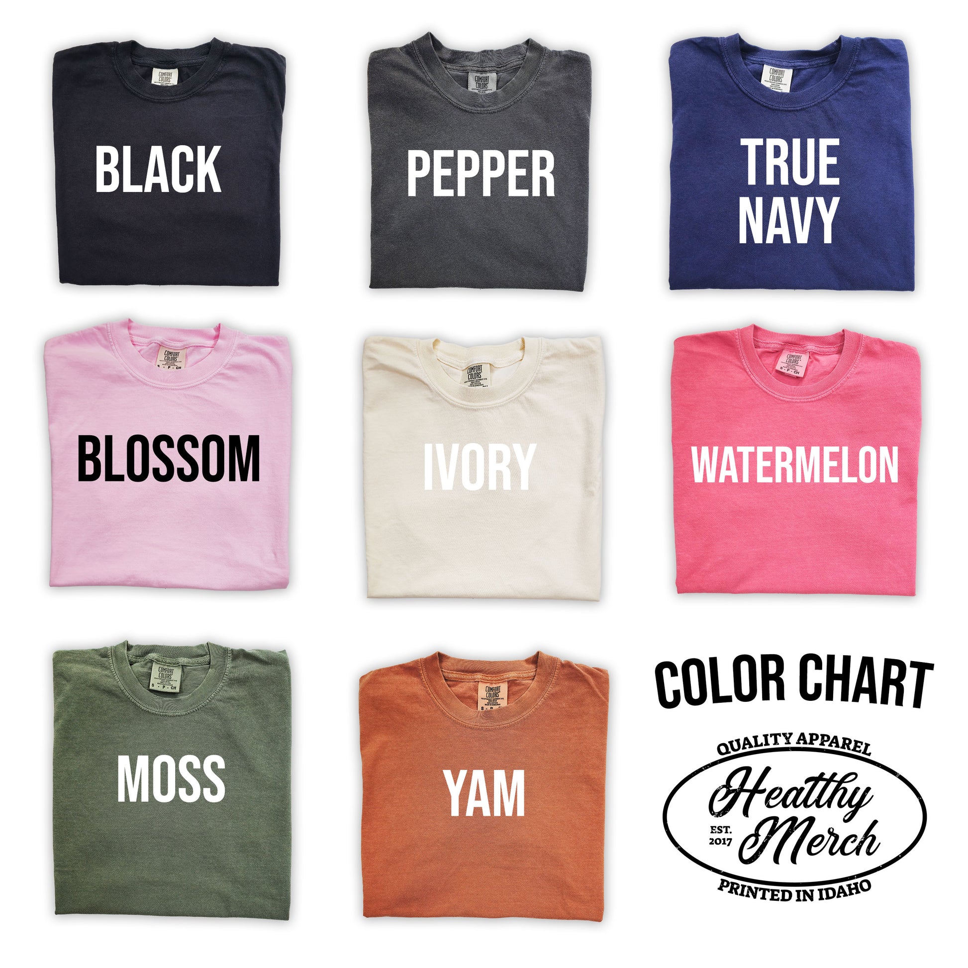 Printed on the Comfort Colors 1717 Tee. These tees are a modern favorite. They are incredibly soft and comfortable to wear. They are 100% ring spun cotton and are pre-shrunk from factory. There should be close to no shrinkage for you at home with this garment. This model uses a pigment dye color that provides a vintage look that will remain. These are in Unisex sizing (which is basically just Men's). Please refer to the sizing chart up above in the listing pictures. TO GET THE OVERSIZED AND BAGGY LOOK you may want to size up. I know you will love this tee!